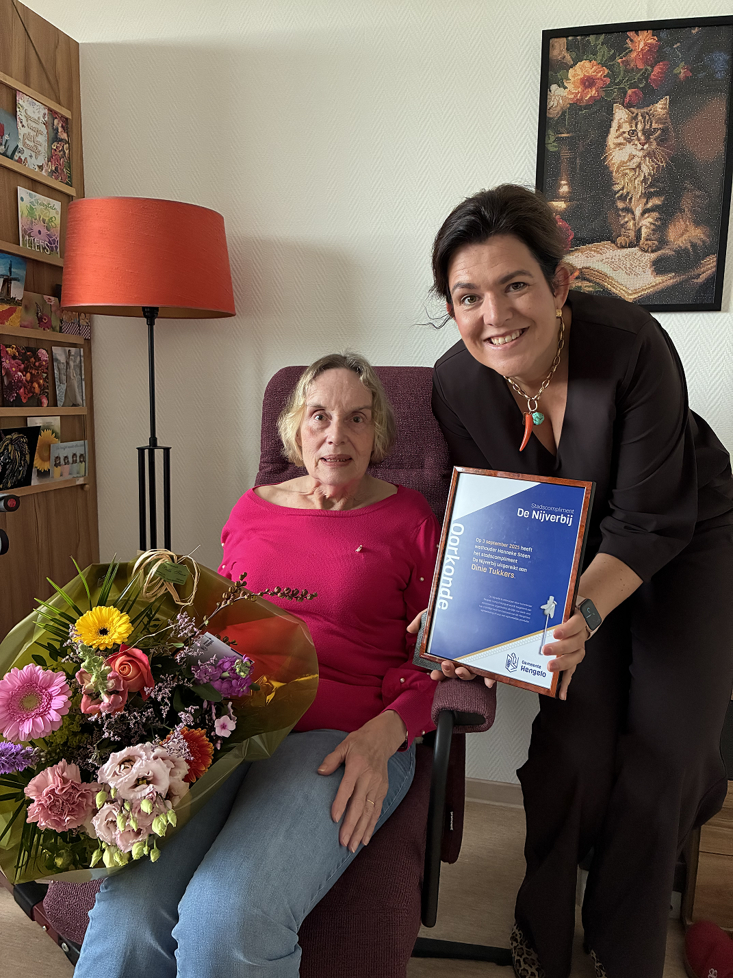 Op woensdag 3 september reikte wethouder Hanneke Steen het Stadscompliment, De Nijverbij, uit aan mevrouw Dinie Tukkers. De onderscheiding werd haar opgespeld om 15.00 uur tijdens een bijeenkomst in verpleeghuis Borsthuis, P.C. Borstlaan 10, Hengelo, waar mevrouw Tukkers momenteel verblijft.